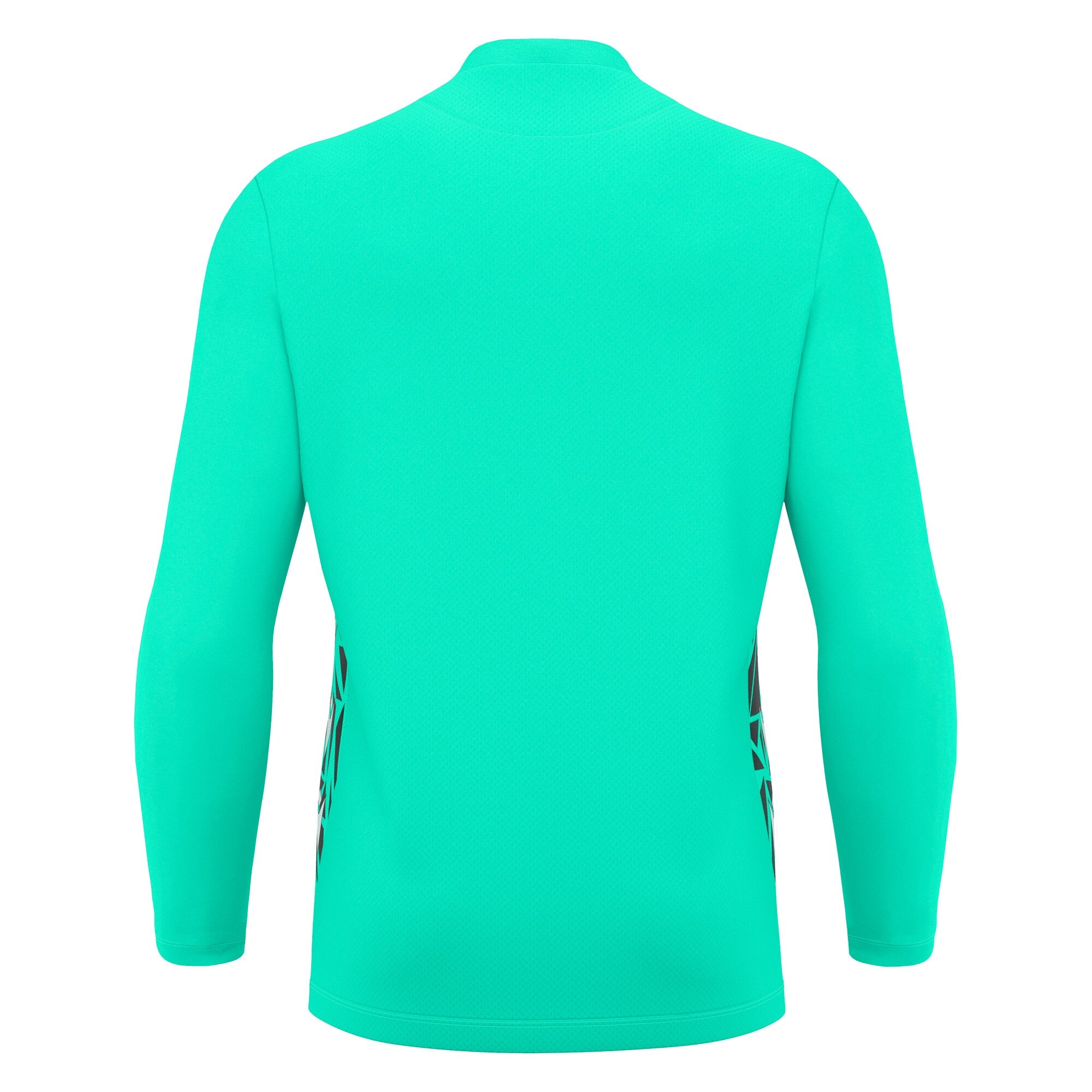 Guler în V din tricotaj cu bordură (piping) frontală, Textură sublimată pe partea frontală ton pe ton, Inserții laterale din Eco mesh cu textură și logo Macron Hero sublimat, Spate din Eco micromesh.
